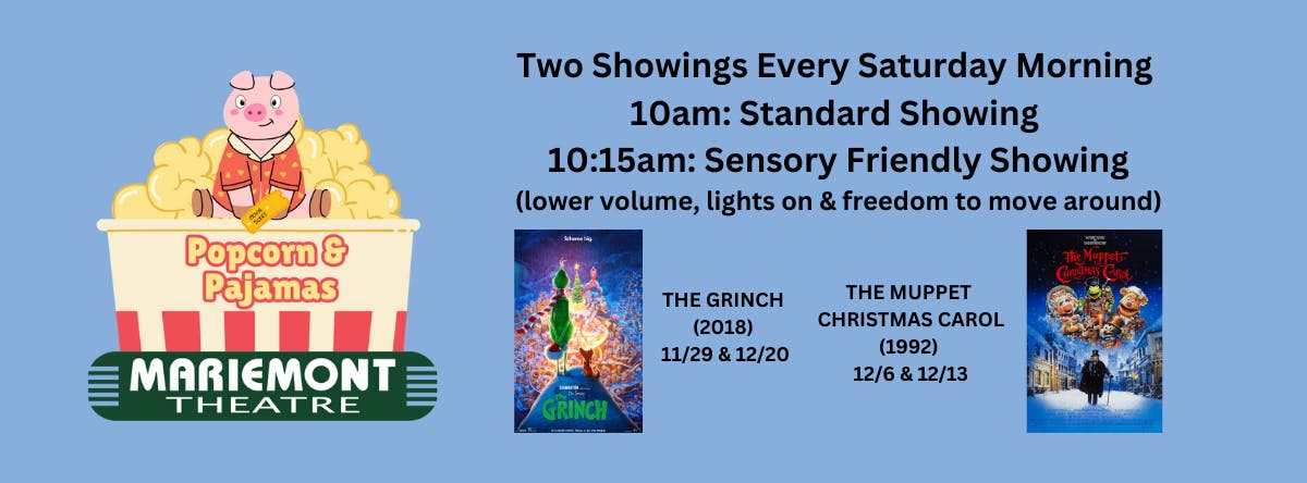Join us at the MARIEMONT every Saturday morning for POPCORN & PAJAMAS - We'll be hosting two showings of a family friendly film each Saturday morning and our guests can choose how they would like to see it!